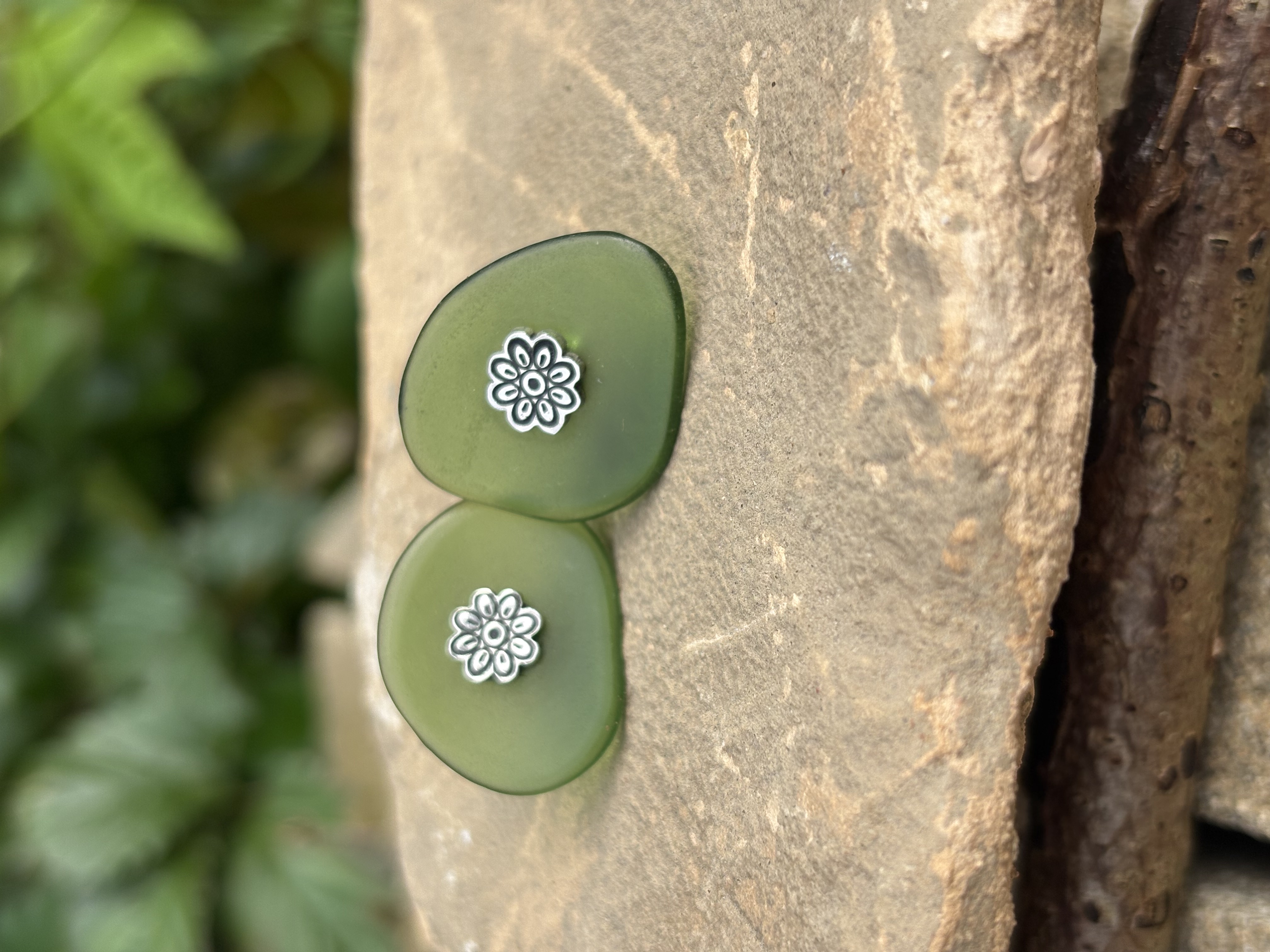 Zarte Natürlichkeit für jeden Tag: Die Ohrstecker „Ava“ vereinen feines 925er Silber mit geschliffenem Glas in sanftem Grün. Mit einer Größe von ca. 2 x 2,5 cm und der filigranen Blütenverzierung wirken sie verspielt und dennoch elegant. Das Paar ist ein liebevoll gefertigtes Unikat – handgemacht in meiner Werkstatt.